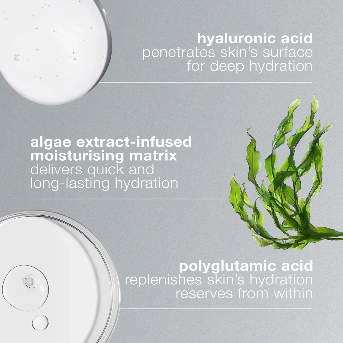 Kick-start skin’s hydration cycle: long-lasting serum immediately floods skin with hydration, replenishes from within, and helps prevent future hydration evaporation. Full-circle hydrating serum utilizes an enhanced form of Hyaluronic Acid to penetrate skin’s surface for deep hydration and more supple, radiant skin over time. An Algae Extract-infused moisturizing matrix delivers quick and long-lasting hydration.